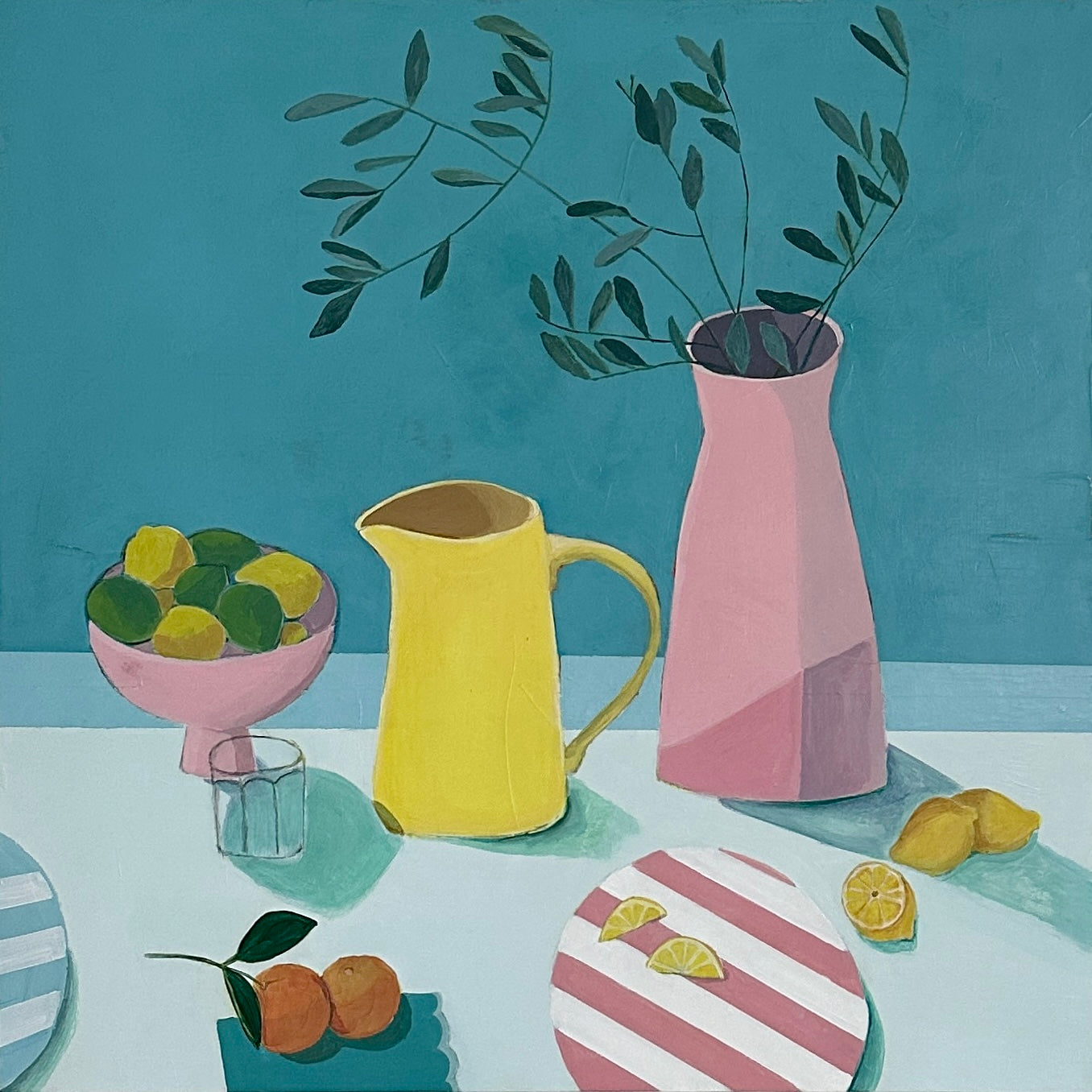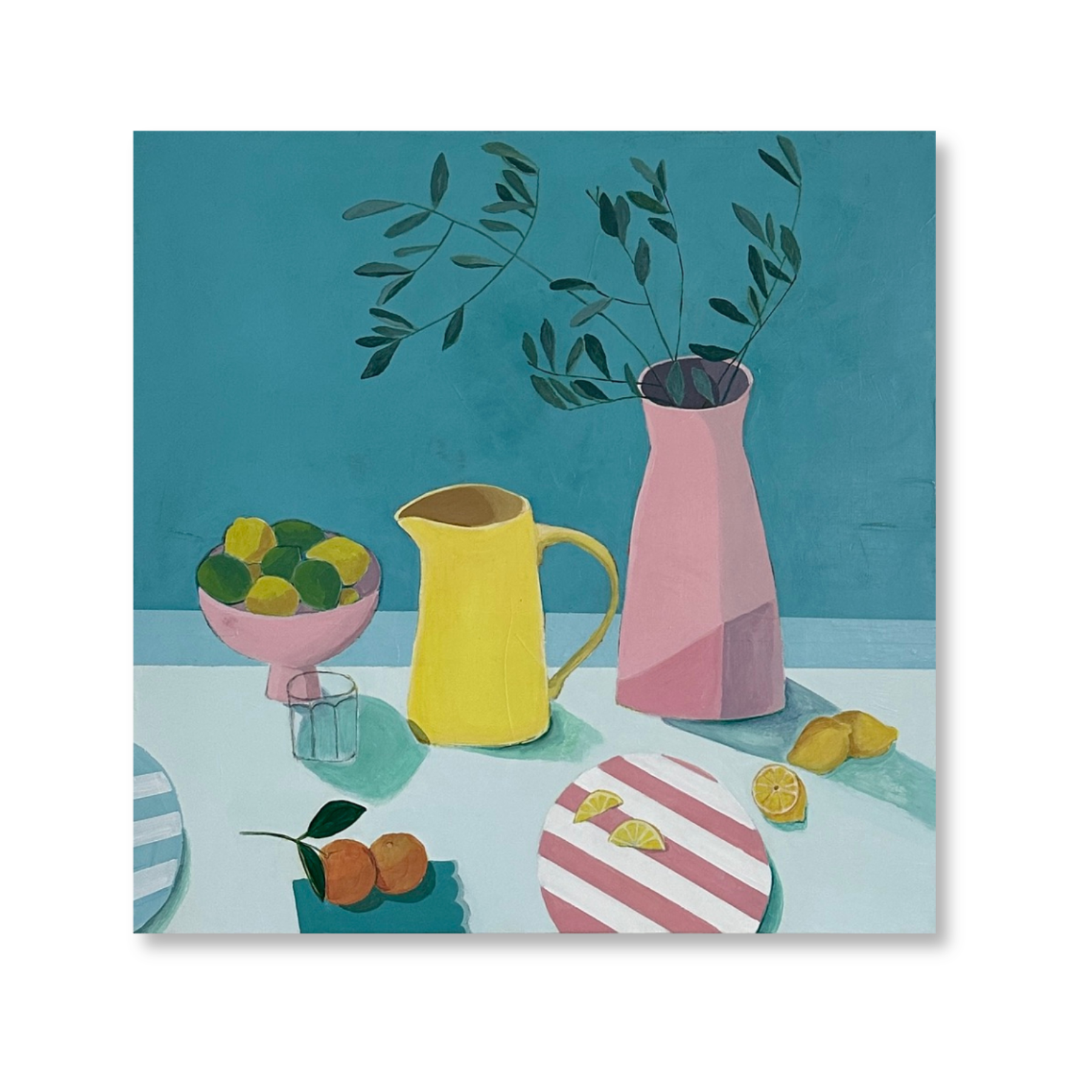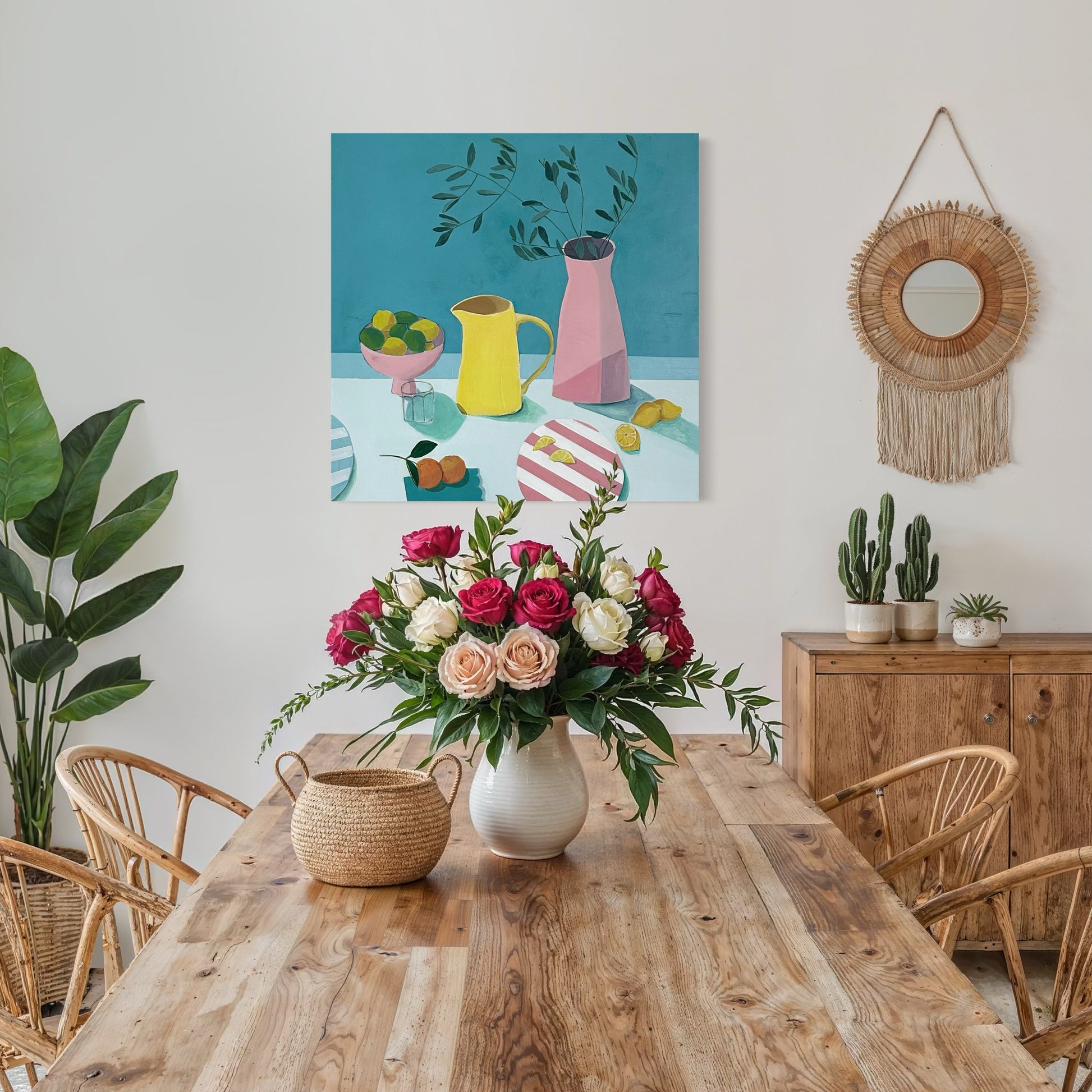 The Magic We Gave Off is an original mixed media still life painting. Bright yellows and pinks are sure to bring joy to your walls. Painted on cradled wood panel and finished with cold wax, "Magic" measures 36x36x1.5"